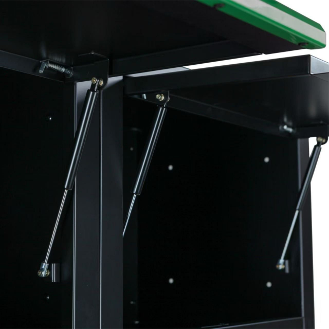 Boven het achterpaneel bevinden zich twee afsluitbare opbergkasten, ideaal voor het veilig opbergen van waardevolle of kleinere gereedschappen en accessoires. Dankzij de stevige wielen en het ergonomische handvat is de gereedschapswagen eenvoudig te verplaatsen, waardoor hij flexibel inzetbaar is in elke werkomgeving.